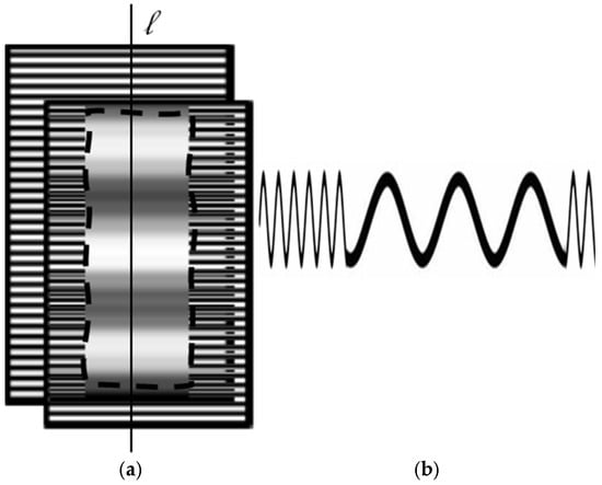 The moiré patterns appear in the region wherein two grids with parallel lines overlap (superimpose) each other (one grid is transparent). To show the pure moiré patterns themselves (which are a low-frequency component of the overlap), a low-pass filter (in the simplest case, averaging) is applied. The dashed line at the center of Figure 2a shows the result: the pure patterns. The moiré patterns in the grids with parallel lines are parallel to the grid lines. Considering the vertical cross section is sufficient to estimate the moiré patterns in parallel grids with the horizontal lines. The cross section (intensity profile) along the vertical line (l), which is perpendicular to the vertical lines of the grid, is shown in Figure 2b. Such a one-dimensional (1D) profile completely describes the moiré effect in grids with parallel lines. Therefore, we effectively consider a 1D effect.