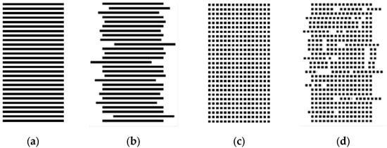 Besides regular grids, we can also consider some nearly regular graphical objects arranged in rows. For example, the pattern in Figure 14a consists of segments of straight lines lying at the same height in each row. Also, some of the black squares of the square grid shown in Figure 13 can be recolored or even removed, as in Figure 15a. In these cases, the profiles along different lines are already different (see Figure 14b,c and Figure 15b,c). However, the periodic structure can be recognized in the average vertical profiles (obtained by summation along the image lines), shown in Figure 14d and Figure 15d.