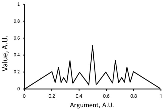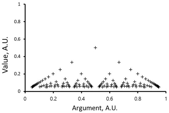 In this case, the number of intersection points, depending on the angle, will follow Thomae’s function [], defined as follows: