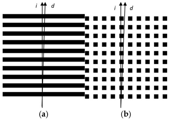 In the measurements, the operations are performed along the vertical line. At a certain misalignment, there is practically no difference between the processing along the vertical ideal (denoted as “i”) and inclined deviated (denoted as “d”) lines in the line grid (see Figure 9a). However, the dot matrix (e.g., a square matrix) requires more accurate angular alignment than the line grid due to the non-zero peak width. For example, when the scan line leaves the square at the other end of the dot matrix at an angle of approximately arctan (1/2n) (n is the number of squares) (see Figure 9b), a sharp change in intensity may occur. In subsequent processing, this may lead to a shift in the intensity of the moiré pattern and then to an incorrect measurement.