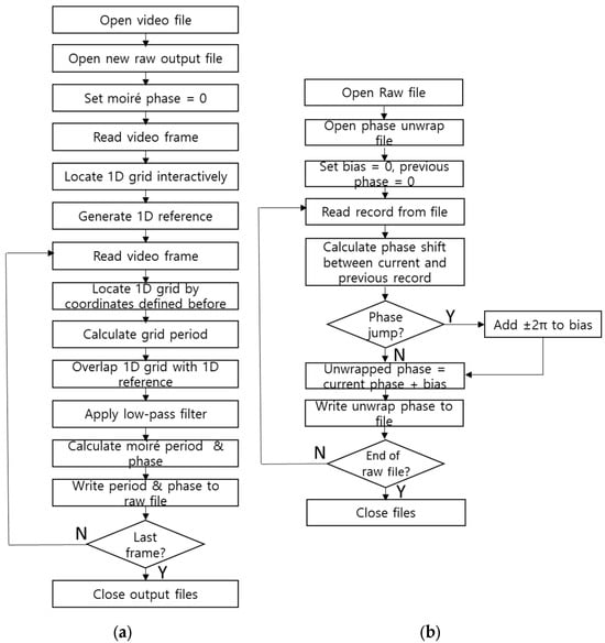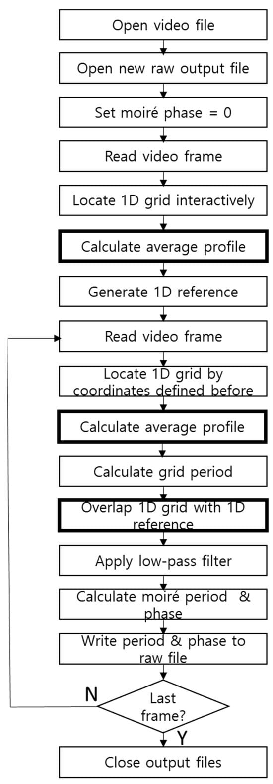 In the startup process (see upper part of Figure 11a), the first video frame is displayed in a pop-up window, and the start and end points of the cross section are located in the image interactively. Accordingly, we generate a common 1D reference (array) for the entire video. These points will be used for all the video frames one by one. Then (lower part of Figure 11a), we read all the video frames and superimpose the cross section of the current grid (using the points defined in the startup) with the reference. The product is filtered using a Gaussian filter, and moiré patterns are obtained. Their period and phase are measured and written to the raw file. In the second stage (see Figure 11b), the raw phase is unwrapped by adding/subtracting the period corresponding to the sign of the detected phase jump between the current and previous frames, as in []. The result is written to the file (deferred version of the system) or displayed on the screen (real-time version).