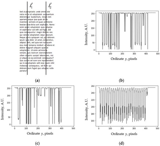 (a) Latin text lorem ipsum. (b,c) Its profiles along lines l1 and l2. (d) Average by rows.