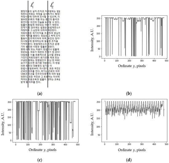(a) Text lorem ipsum in Korean language (the script is not based on the Latin alphabet). (b,c) Its profiles along lines l1 and l2. (d) Average profile.