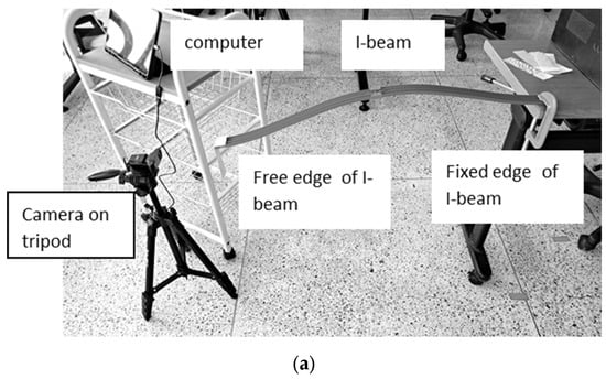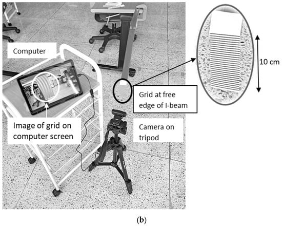 The vibration was excited by manually pushing the I-beam (using a similar plastic rod) approximately in the middle. The FHD video (1920 × 1080, 30 frames per second) was recorded for about 1 min. The grid image’s typical size was 480 × 260 pixels. The grid image can be seen on the computer screen shown in Figure 19b.