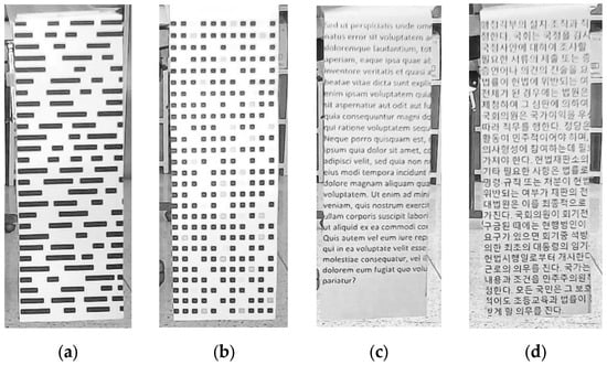 Photographed grids arranged in rows. (a) Dashed line; (b) grayed square matrix; (c) Latin text; (d) Korean text (the writing system is not based on the Latin alphabet).