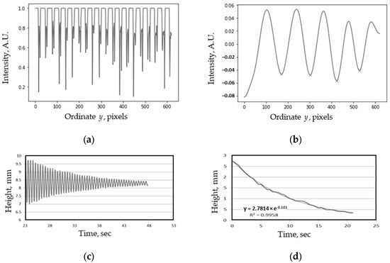 The experiments showed the following: the mean measured period (across all grids) was 0.494 s, the average decrement was −0.104 s−1, and the oscillation frequency was 2.024 Hz with an average lifetime of 9.615 s. There was no difference between the period of oscillation measured using the linear grid and the period measured using other graphical objects. The NRMSE of the period (across all grids) was less than 0.3%, the NRMSE of the decrement was less than 6%, and the determination coefficient of the exponential regression (R2) was over 0.986 (i.e., 98.6%). Such values of the NRMSE and R2 mean that the results of the measurements using all grids are similar. These experiments demonstrated the reliability of moiré measurements using the average profile of various graphical objects arranged in rows.