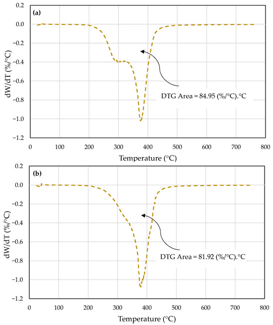 The shapes of the DTGs are depicted in Figure 5. For the M1 mixture with zero RAP, DTGs depicted three zones with two peaks for the RTFO and recovered binders, as shown in Figure 5a. The first zone with little mass loss indicates the presence of few chemical or physical reactions. The derivative weight in this area is zero. In the second zone, thermal degradation produces volatiles and the derivative weight declines gradually. Weak chemical bonds are broken in this zone, and small gaseous components are generated. Molecules crack quicker in the third zone, breaking strong bonds. Larger molecules break down into smaller ones in the gas phase. In the third zone, the derivative weight reaches its lowest point before settling to zero. Thermal degradation slowed beyond this point, leaving just residue (coke) as the final component [47]. No significant difference was observed between the DTGs’ shapes of the RTFO and the recovered binders for the M1 mixture with zero RAP, as shown in Figure 5a.