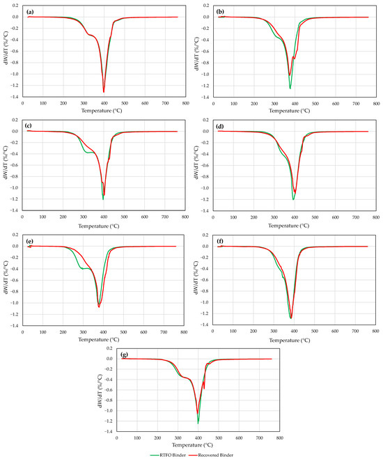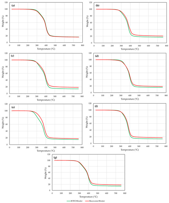 TGs of (a) M1; (b) M2; (c) M3; (d) M4; (e) M5; (f) M6; (g) M7 recovered and RTFO binders.