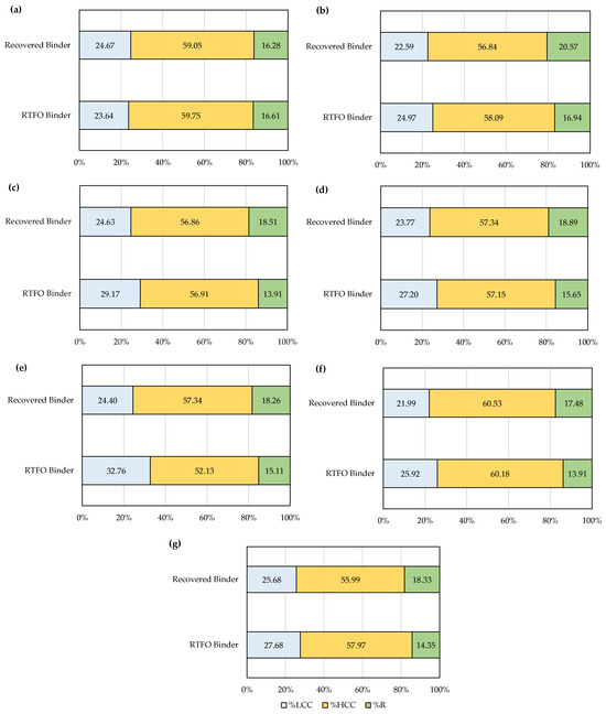 Figure 7 shows the thermal decomposition components of recovered and RTFO binders. Figure 8 depicts the percentages of change in thermal decomposition components; these percentages were computed for the recovered binders compared with RTFO binders. The RTFO binder was stiffer than the recovered binder from the M1 mixture without RAP, as seen in Figure 7a. This conclusion was reached because the M1 RTFO binder had a lower %LCC, higher %HCC, and higher %R than the recovered binder (see Figure 7a). When comparing the M1 recovered binder to the RTFO binder, the %LCC increased by 4.36% while the %R decreased by 1.97% (see Figure 8). These findings were consistent with the TG shapes, Tendset, and DTG areas outlined in previous sections.