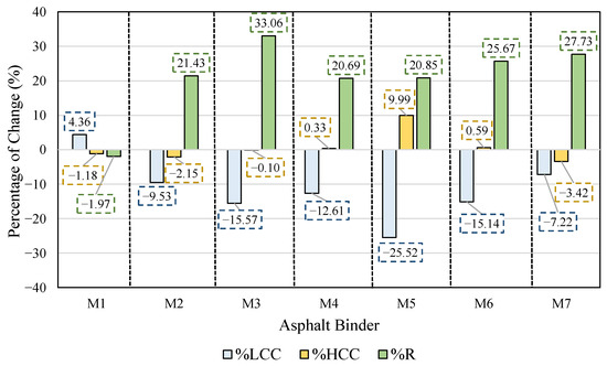 Conversely, recovered binders from RAP-containing mixtures (M2 to M7) were stiffer than RTFO binders, which was consistent with earlier findings (Tendset, DTG, and TG shapes, as well as DTG areas). Figure 7b–g shows that recovered binders from mixtures including RAP had a higher %R and a lower %LCC than the RTFO binders. Comparing recovered binders to RTFO binders, Figure 8 shows that the %LCC change ranged from −7.22 to −25.52% and the %R change ranged from 20.69 to 33.06%. This occurred because more aged components from the RAP binder interacted with the original binder, resulting in more aged components formed in the recovered binder. This led to a drop in the low-molecular-weight fractions (measured by %LCC) and an increase in the asphaltene fraction (measured by %R).