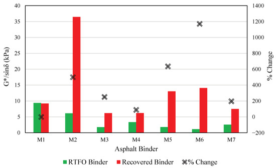 This section assesses the G*/sinδ parameters of recovered and RTFO binders. Figure 9 displays the G*/sinδ parameters for RTFO and recovered binders measured at 64 °C. This parameter reflects the binder’s stiffness and elasticity: a higher parameter indicates a stiffer and more elastic binder. Except for the M1 binders, all recovered binders showed greater G*/sinδ parameters than the RTFO binders. Furthermore, except for the M1 binders, recovered binders exhibited lower %LCC values and higher %R values in comparison to the RTFO binders. M1 is the only mixture with zero ABR% using RAP. This demonstrates how incorporating RAP in asphalt mixtures influences the thermal and rheological measurements of the recovered binders.