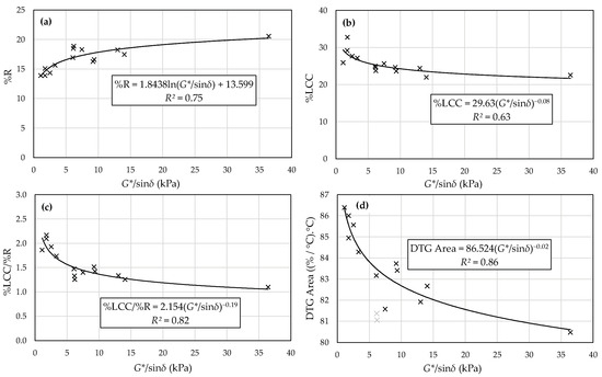 Correlations between rheological and thermal characteristics: G*/sinδ versus (a) %R; (b) %LCC; (c) %LCC/%R; (d) DTG area.
