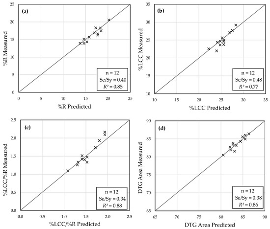 Predicted vs. measured thermal characteristics: (a) %R; (b) %LCC; (c) %LCC/%R; (d) DTG area.