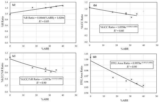 Correlations between the percentage of ABR using RAP and thermal characteristics: %ABR versus (a) %R ratio; (b) %LCC ratio; (c) %LCC/%R ratio; (d) DTG area ratio.