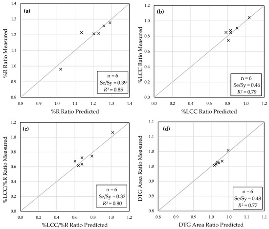 Predicted vs. measured thermal ratio characteristics: (a) %R ratio; (b) %LCC ratio; (c) %LCC/%R ratio; (d) DTG area ratio.