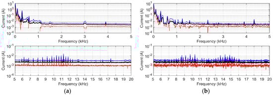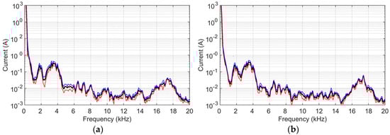 Figure 3 shows the pantograph current spectra measured in acceleration and braking conditions and using the same OPs. Variability was calculated by collecting three test runs, both in ACC and BRK, and the σ/μ ratio ranges between 1% and 3% for all components. It is noted that the frequency resolution being limited by the available instrument’s 800 frequency bins helps to smooth the curves.