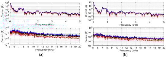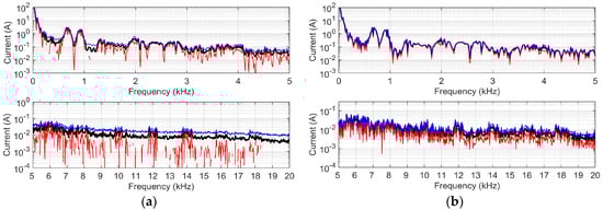 Figure 4 shows the pantograph current spectra measured in acceleration and braking conditions and using the same OPs; DC traction current harmonics are more variable compared to AC, as no fundamental is available, except for the known TPS harmonics. The analysis was performed then only for those components clearly correlated with RS emissions. Variability over the four runs was 3–5%, whereas values > 30% may characterize uncorrelated components. A correlation analysis of