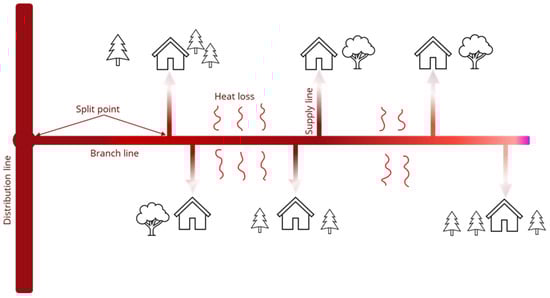 Small branch of a district heating network. Warm water enters from the left and is distributed to the connected houses. The district heating water continuously cools down as it gets further away from the heat plant.