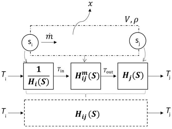 and similarly for the other terms, where is a column vector of ones, in which terms describing correlated effects are distinguished from those representing uncorrelated effects to represent a separation of parameters in the transfer function of the medium from those in the transfer functions for the sensors. Specifically, the term (and, similarly, , and ) is associated with the medium and is calculated using nonlinear regression models or fitting functions using data-driven approaches. Alternatively, physics-based partial differential equations can be transformed to the Laplace domain to identify the poles and zeros of the transfer function for the medium. For example, for a simplified one-dimensional heat transfer problem in a duct (see Figure 2), the energy balance can be modelled as:
