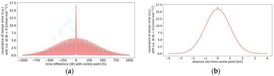 The measurement errors for the sensors, indexed by with at the temporal points indexed by with , can be modelled as a multivariate Gaussian distribution with mean zero and an dimensional covariance matrix . To make this covariance matrix manageable and easy to evaluate for arbitrary spatial locations and temporal points , the kernel function arising in Gaussian process modelling [51] can be used. Such a function returns the covariance of, in this case, the measurement errors for any combination of two inputs and defining two points in spacetime. To select an appropriate shape of the kernel function and to estimate the values of its free parameters , it is required that a sample of the measurement errors is available. This can be the case when the sensor readings are compared with low-uncertainty reference instrumentation, the latter providing a good proxy for the true values of the measurands. To be able to determine an appropriate covariance structure for both the spatial and temporal directions, the dataset should include variations in all relevant variables, i.e., in both space and time. In concrete cases when there is not enough experimental data, for example, when all measurements have been performed at a single location, some expert-based assumptions may be needed to construct a reasonable functional structure and parameter values for the kernel function giving the covariance of the measurement errors and . Figure 3 shows an example, based on the QUANT dataset [52] using data from low-cost air quality measurements combined with reference data provided on the same website, of a kernel function with respect to time, accounting for periodicity in the observations (which can be caused by daily patterns), as well as a kernel function with respect to space, where the correlation decays the further two sensors are removed from each other.
