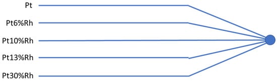 Thermocouples made of platinum (Pt) and its alloys with rhodium (Pt-Rh) are widely used in high value manufacturing applications as they offer relatively high thermoelectric stability in comparison with other thermocouples, particularly at temperatures above approximately 1000 °C. For example, noble metal thermocouples typically drift by tenths or hundredths of a °C per month on continuous exposure above this temperature, whereas less expensive thermocouples can typically drift by more than ten or a hundred times as much in the same period. The principal cause of drift in noble metal thermocouples is vaporization of Pt and Rh oxides from the wires, which causes a local change in composition, and hence, in the Seebeck coefficient [59,60]. The magnitude of this effect depends on the Pt-Rh composition of the wire. A thermocouple assembly can comprise several wires. For example, a 5-wire thermocouple with the widely available compositions Pt0%Rh (or Pt), Pt6%Rh, Pt10%Rh, Pt13%Rh and Pt30%Rh offers 10 possible pairs of wires and so 10 thermocouples (see Figure 5). As there is some commonality across the multi-wire thermocouples (e.g., a Pt6%Rh versus Pt30%Rh thermocouple and a Pt6%Rh versus Pt13%Rh thermocouple shares a Pt6%Rh wire), the question is whether the resulting correlations between the measurements made by different thermocouples in the ensemble can be employed to provide useful information about drift and an improved (lower uncertainty) measurement of temperature.