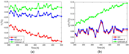 To illustrate the approaches, measured values of temperature drift were collected from eight thermocouples in a 5-wire thermocouple as illustrated in Figure 5 [63]. The data were obtained while the thermocouple was immersed in a calibration artefact (a cobalt-carbon fixed-point cell with a melting temperature of 1324.29 °C) and recorded over a time period of about 500 h. The study focused on the time period between about 200 h and 500 h with data at the start of the time period omitted, as in that early period, there can be mechanisms (other than evaporation) that cause the observed calibration drift. The estimates of temperature at each time point obtained from the three approaches described, and the standard uncertainties associated with those estimates, are shown in Figure 6. The estimates obtained from the approach ‘Unknown ’ (based on solving expression (22)) are better than those from approach ‘Known ’ (based on solving expression (20) for each time ) that are in turn better than those from approach ‘KC’, and so suggest there is benefit in including physics knowledge in the estimation problem. The results indicate that including more physics knowledge does not necessarily translate into smaller uncertainties associated with the estimates of temperature the uncertainties are largest for the approach ‘Unknown ’, although we might hope for more ‘realistic’ uncertainties in that case. A more comprehensive comparison of the methods described above, including other methods, using data collected from different multi-wire thermocouples subject measuring in different temperature environments is currently underway and will be reported elsewhere.