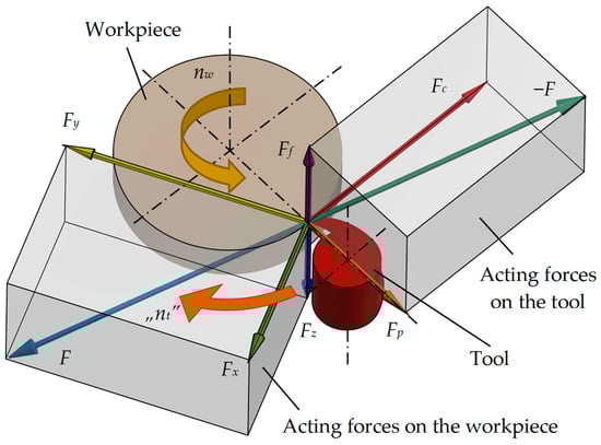 The differences between the tool-centered and machine table-centered coordinate systems are illustrated in Figure 3. The corresponding Fc, Ff, and Fp forces can be calculated at a given moment based on the measured values of the Fx, Fy, and Fz forces and the relative position of the workpiece and the tool. A parallel can be drawn with the evaluation of face milling, when the cutting force components are recalculated. In studies of the aforementioned process, the forces acting on the cutting edge rotating with the milling tool (namely Fc, Ff, and Fp) are often examined instead of analyzing the forces acting on the workpiece in the X, Y (plane of the machined surface), and Z (parallel to the tool axis) directions. However, the main difference in face milling is that the location of the cutting force point of application changes only within the plane of the machine table (rotating with the tool). In rotational turning, this contact point also moves in the Z direction (parallel to the spindle), along with the active segment of the helical edge, which is in contact with the workpiece.