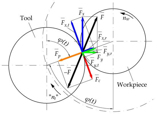 The formulas used for the calculations are described based on Figure 4. In the designed measurement system, the tool was mounted into the fixture so that the start of the chip removal fell within the +Fx range and exit from the cut fell within the −Fx range. φ(t) in Figure 4 represents the angular displacement of the intersection point of the enveloping cylinders of the workpiece and the tool in function of the elapsed time (t). This angle is measured from the starting point, and it increases over time, as the circular rotation of the feeding movement occurs. It can be seen that the measured Fx and Fy forces are both perpendicularly split into two components: 1-1 tangential (Fx,t and Fy,t) and 1-1 radial (Fx,r and Fy,r) to the enveloping cylinder of the tool edge.
