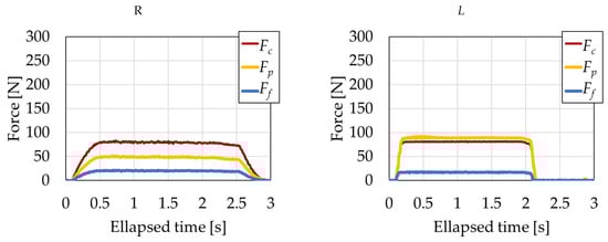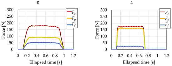 The piezoelectric dynamometer has three outputs, in which a charge proportional to the magnitude of the force in the respective direction is generated. The three signals are converted into voltage values by three Kistler 5011 charge amplifiers (Kistler Instrumente AG, Winterthur, Switzerland), which are then measured and transmitted to a data acquisition computer by an NI-9215 data acquisition unit housed in an NI cDAQ-9171 chassis (National Instruments (NI) Corporation, Austin, TX, USA). The data, sampled at a frequency of 1000 Hz, are displayed and stored for further processing using a program developed in NI LabVIEW 2018 SP1 software (National Instruments (NI) Corporation, Austin, TX, USA). The force measurement system was calibrated using the mechanical force measurement unit of the Institute of Manufacturing Science.