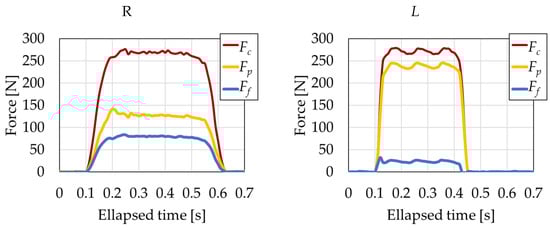 Force system in the X-Y plane. The vectorial split of the Fx (blue arrows) and the Fy (green arrows) and the resultant Fp (orange arrow) and Fc (red arrow) forces are shown.