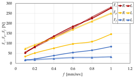 The maximum values of the measured force components (Fc, Fp, and Ff) in function of the feed in rotational (R) and longitudinal (L) turning.