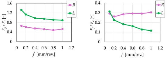 The calculated ratios of the measured force components (Fp/Fc and Ff/Fc) in function of the feed in rotational (R) and longitudinal (L) turning.