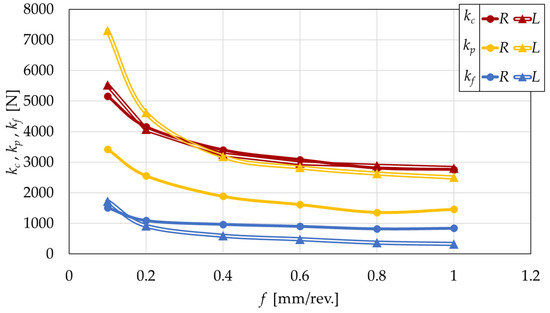 The cutting forces were measured using the previously described measurement system. From the results, the maximum value of the cutting force components (Fc,max, Fp,max, and Ff,max) was determined in the constant cross-sectional chip removal phase for the 12 setups. The ratios of these results were also analyzed since this information leads to a better understanding of the load of the cutting tool. As mentioned before, an analysis of the specific load is also important in the evaluation of the cutting force results. The specific cutting force of the three force components (kc, kp, and kf) studied can be calculated as follows: