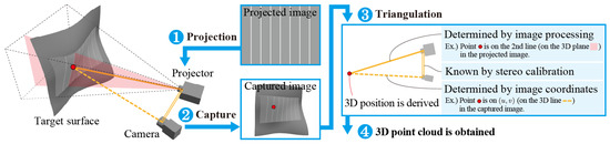 Non-contact 3D measurement technology, which uses light to acquire the three-dimensional shape of an object, is used in a wide range of fields such as inspection and survey [1,2,3]. Three-dimensional measurement technology has been developed mainly for stationary objects and improved to achieve high accuracy, expand the measurement range, and handle various surface conditions and scales [4,5,6,7,8,9,10]. In recent years, high-speed 3D measurement technology has been developed to acquire geometry with a high temporal resolution such as 1000 fps, which far exceeds the speed of human perception—video rate (30 fps). These technologies have been utilized in systems that capture and immediately respond to dynamic objects with motion and deformation in fields such as robotics, mobility, security, interfaces, and XR including augmented reality (AR) and virtual reality (VR) [11,12,13]. In 3D measurement of such moving objects, the measurement device itself must be fast enough to respond to the speed of the target, and the measurement method must be applicable to dynamic objects. On the other hand, most conventional measurement methods assume a stationary object and calculate the 3D position using multiple sample values acquired from the sensor in a time division manner, which may cause measurement errors or measurement failures when applied to dynamic objects [14,15]. Therefore, accurate measurement of time-varying objects requires advanced measurement methods that extract 3D information from as few samples as possible. In addition, in order to immediately feedback the obtained 3D information to the system and manipulate the object appropriately, the amount of computation from sampling to calculation of 3D information must be small and with low latency.