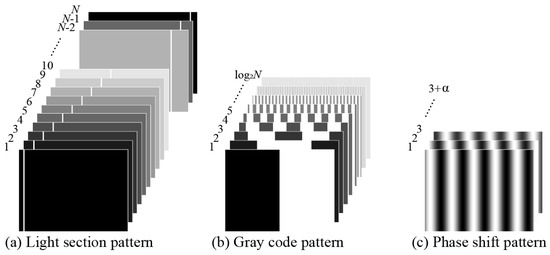 The Gray code method [30], in which the phase is described as a discrete binary value, can measure N phases in frames by discriminating the phase of each point in the image with a binary pattern sequence using Gray codes, as shown in Figure 2b. The Gray code method reduces the number of frames required for measurement compared to the light section method, but requires a high-resolution projector for high precision because the phase is a discrete value.