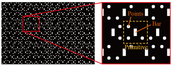 In contrast, a pattern called a segmented pattern, as shown in Figure 3, which has independently identifiable primitives even with a single frame, has been proposed [46]. The method using the segmented pattern achieves an efficient corresponding point search even with the simple pattern by the three-viewpoint geometric structure between the projector and the two cameras. The three-viewpoint epipolar constraints can narrow the search area more than two-viewpoint stereo setup [47,48], and contributes to the speedup of the measurement. Additionally, the hierarchical structure of the bar and points reduces the amount of computation to identify the phase. As a result, the system achieves a computation time of about 2 ms and robustly realizes real-time 3D measurement at 500 fps with 0.8 mm mean error at 450 mm distance. However, optimization of pattern density with respect to image size has not been addressed.