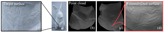 High-speed measurement and integration of depth and normal [53]. The target surface has the detailed curving patterns (a) and it is not easy to measure the detail by depth sensing. Surface normal measurement using the photometric stereo method can provide the detail but cannot measure the absolute position instead. This research introduces high-speed sensing setup of both of them and the real-time integration algorithm (b–d).