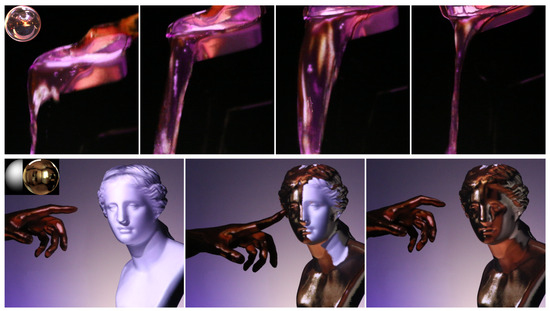 MIDAS projection [13]. This system achieves dynamic projection mapping even onto non-rigid bodies and fluids without markers and shape models by measuring surface normals in real time. The materials of the liquid and the statue are virtually changing by the projection.