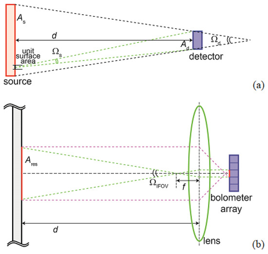 From a fundamental metrological perspective, Equation (1) contains too many unknowns. The temperature of the source, , is the quantity of interest but uncertainties are added by the estimates of (the distance between emitter and instrument, d, is not accurately known), (which is not necessarily known for the material investigated) and the emitter area, , within the opening angle of the detector (also depending on distance between emitter and instrument, d). This problem is reduced when also considering the opening angle of the detector, which is a known property of the instrument and defined as = . When considering that = , Equation (1) can be expressed as