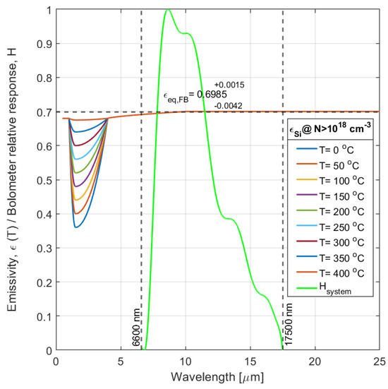 Bolometric measurement of the wafer surface temperature profile has been generally applied during silicon microfabrication. Therefore, data on the spectral emissivity of silicon, , is important and results on characterization efforts on is available in literature [28,29,30]. This information is used for constructing the curves shown in Figure 2.