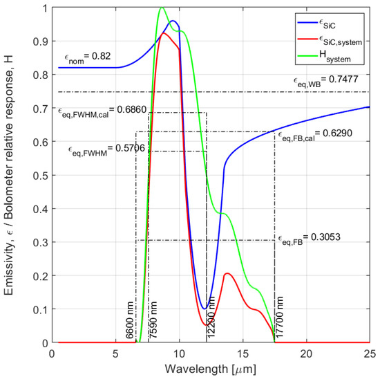 which is the general rule for a graybody emitter. However, SiC has a strongly wavelength-dependent emissivity within and the second part of Equation (6) is non-zero. Therefore, one cannot simply assign a constant equivalent emissivity, , based on weighted average. Instead, the optimum instrument setting for equivalent emissivity is derived using numeric integration of Equation (6), rather than a calculation of the weighted average of the emissivity only and =