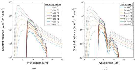 Calculated spectral radiance for a source temperature in the range 200 °C to 800 °C, as incident on the bolometer (dashed line) and as measured at the detector array of the imaging bolometer (solid line) for (a) a blackbody emitter and (b) a SiC emitter.