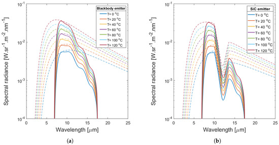 Similarly, the spectral radiance curves for SiC are shown in Figure 4b. Although monotonicity over the temperature range is maintained, the curves are clearly more compressed in the 11–12 μm spectral range. The spectral radiance curves from a blackbody reference emitter are basically used for bolometer calibration.