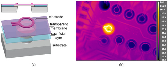 (a) Structure of the membrane with circularly shaped poly-SiC resistors that are used as both temperature sensor and on-membrane heater, and (b) FLIR photograph of the realized device with heating power applied to one of the test structures and measured temperature shown in °C.