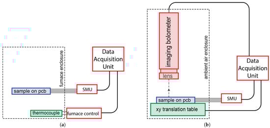 Chips (also referred to as ‘dies’), as in Figure 7b, are cut out of the wafer at selected positions, chip-bonded, and mounted on a printed-circuit board (pcb) for electrical connection to external readout. These are used for calibration of the poly-SiC resistors and measuring their variation of resistivity over the wafer area. In the calibration, the pcb is mounted in the oven using clamps, as shown in Figure 8a.