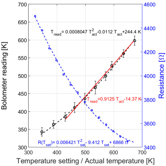 Measurements on the heatable membrane with the blue open bullet points indicating the poly-SiC resistance as a function of furnace setting in a calibration run, while the quadratic approximation is shown as the dashed curve. In addition, the black open bullet points with error bar indicate the bolometer reading as a function of the temperature as measured on-membrane using the poly-SiC resistor, while the quadratic approximation is shown as the dashed curve and the linear approximation as the red curve.
