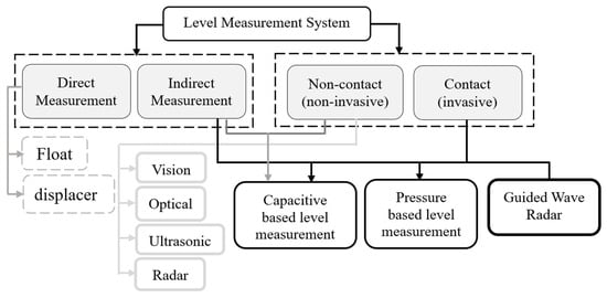 Summary of different methods used in level measurement systems based on direct, indirect, contact, and non-contact techniques.