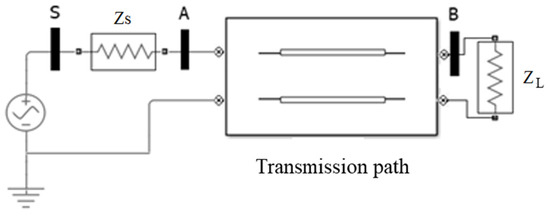 The basic operation of the sensor consists of estimating the liquid level by measuring the transmission characteristics of a line of length L, such as a twisted pair, when a part of it is immersed in the liquid. To implement this, let us assume a sinusoidal wave is supplied to the line through an electrical source at frequencies in the order of a few megahertz, under impedance matching conditions, as shown in Figure 2. The impedance matching condition implies that the impedance of the generator and the impedance of the load are equal to the characteristic impedance of the transmission line (ratio between the electric field and the magnetic field of its fundamental transmission mode). Typically, for a twisted pair this is about 120 Ω, although the technique can be applied to different transmission lines, which can be specifically designed with a desired value. With reference to Figure 2, the generated signal is acquired in 3 different positions: S at the source; A after the source matching impedance, at the line input; B on the load matching impedance, at the end of the line. The three positions can be acquired simultaneously by the same electronics because physically they can be very close, as the line folds and returns to the measuring electronics.