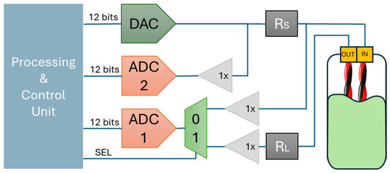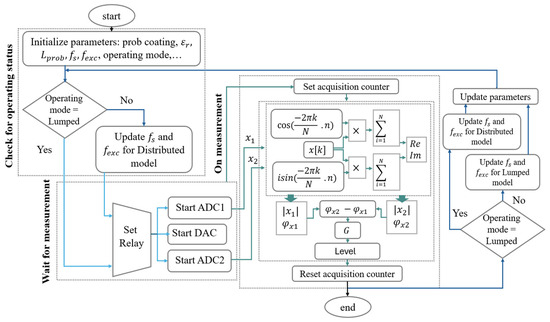 The system begins by initializing critical parameters such as the probe coating properties, relative permittivity (), probe length (), sampling frequency (), excitation frequency (), and operating mode (lumped or distributed model). The first step in the process is identifying the operating status. If the lumped model is selected, the system proceeds directly to measurement acquisition. Otherwise, it updates the and depending on for the distributed model before moving forward. To simplify the design and reduce the hardware complexity, the system utilizes two ADCs instead of three. Measurement point A is directly connected to ADC1, while ADC2 is shared between two different measurement points (S and B) using relays. This relay configuration allows switching between different measurement modes. Depending on the electronics, one can decide to connect the receiving end to the ADC1 and share ADC2 between point S and A.