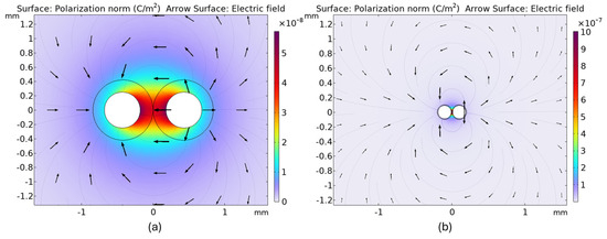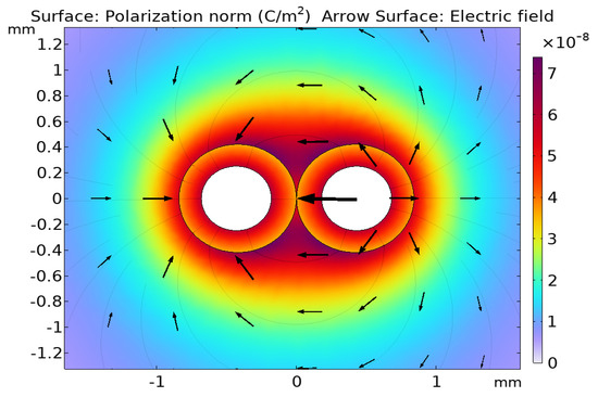 The thinner insulation allows more direct electric field penetration, enhancing the polarization effect. Further amplification of the polarization magnitude is introduced by the smaller conductor separation, leading to stronger charge interactions. Table 1 summarizes the comparison between the two geometry’s electric and polarization field characteristics, always considering water as the surrounding medium.